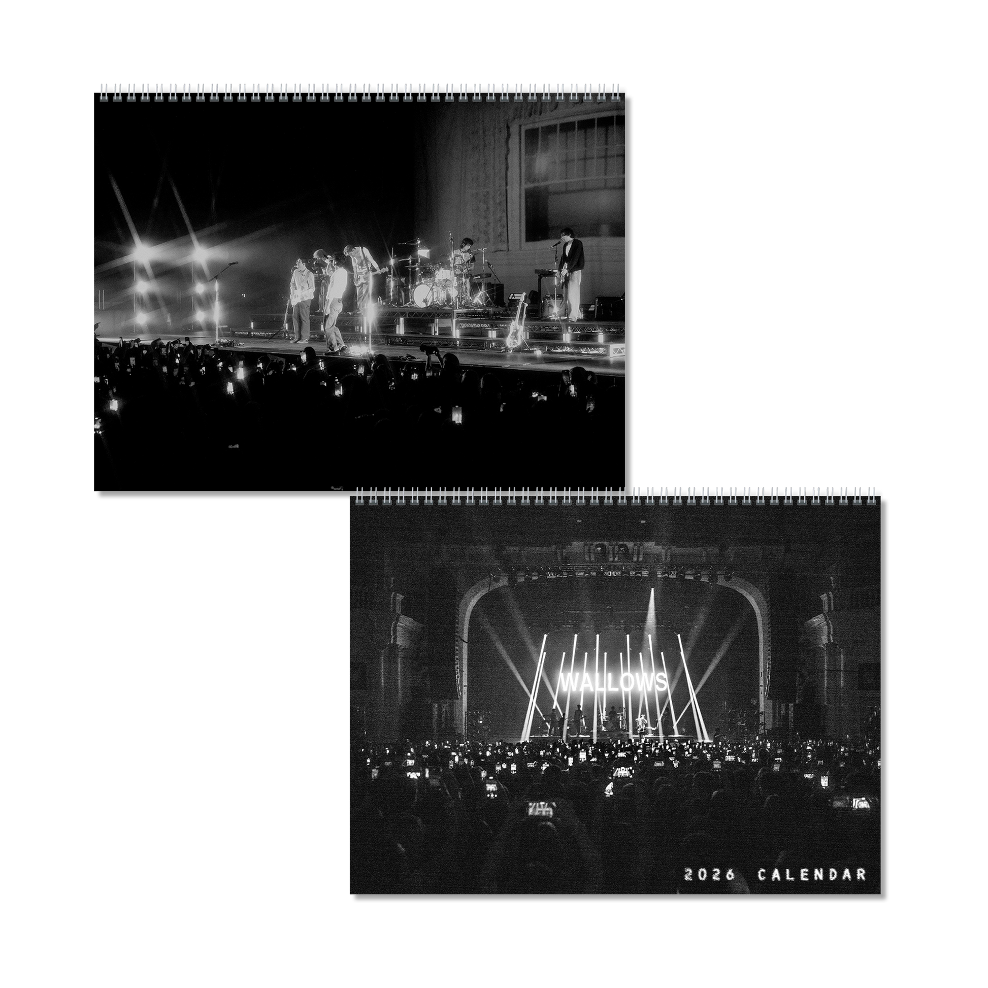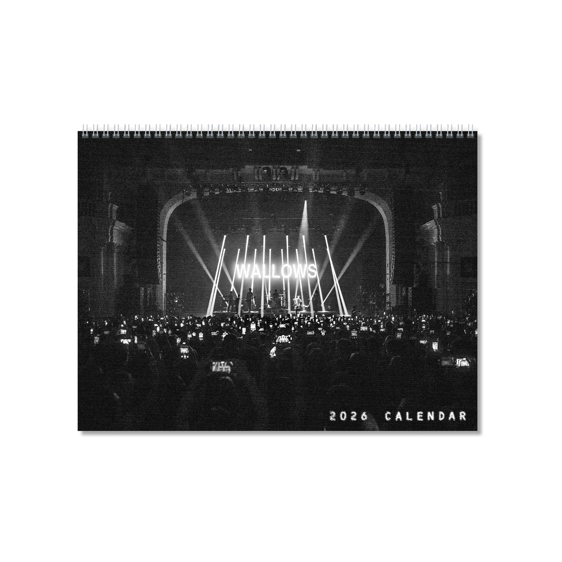Full 12-month calendar for 2026 featuring assorted photos from the Model & More Tour, in addition to important dates in Wallows history highlighted throughout. 9" x 12" Size, spiral bound for easy hanging.
